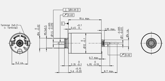 DCX 12 Sはプリロードされたボールベアリングまたは焼結スリーブベアリングで小型ドライブとして入手可能です。オプションの火花抑制 (CLL) を追加すれば、貴金属ブラシ付きの本DCモータの寿命はさらに長くなります